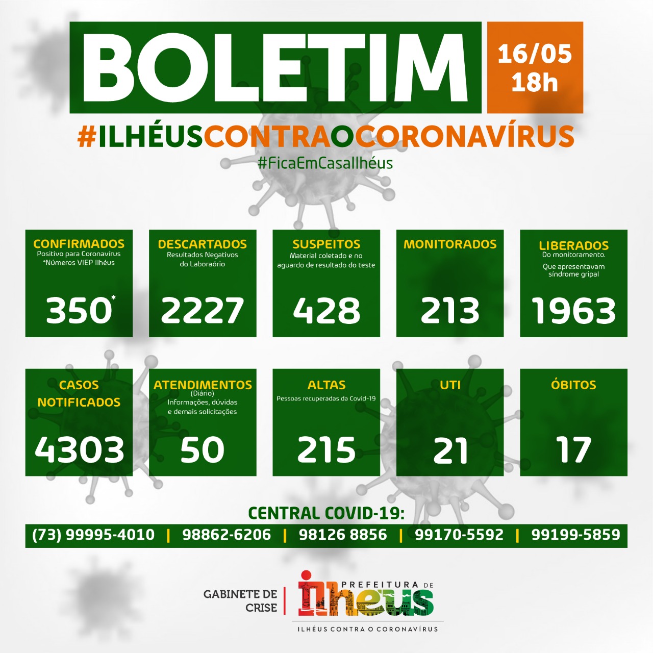 O boletim epidemiológico da Covid-19 em Ilhéus deste sábado (16) informa que 350 moradores do município, comprovadamente, foram infectados pelo novo coronavírus. A cidade já perdeu dezessete pessoas para a doença. Hoje, 21 pacientes estão em unidades de terapias intensivas.