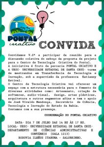 A iniciativa é fruto de uma parceria entre Pontal Criativo e UESC (Universidade Estadual de Santa Cruz – turma de mestrandos em Transferência de Tecnologia e Inovação), sob supervisão da professora Katianny Estival.