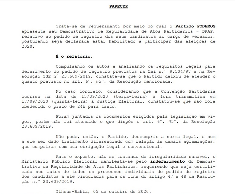 Em parecer apresentado à Justiça Eleitoral nesta segunda-feira, 5, por meio da promotora Maria Amélia Sampaio Góes, o Ministério Público Eleitoral (MPE) manifestou-se a favor do indeferimento do Demonstrativo de Regularidade de Atos Partidários (DRAP) do Podemos em Ilhéus. Isso pode inviabilizar a chapa do partido para a disputa das vagas na Câmara de Vereadores.
