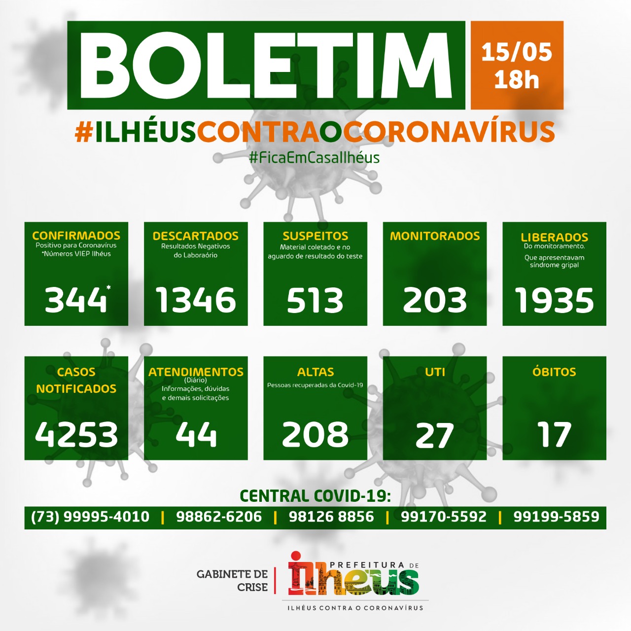 A Secretaria de Saúde de Ilhéus informa que, até a noite desta sexta-feira, 15 de maio, a Covid-19 matou dezessete moradores do município. No total, 344 pessoas foram comprovadamente infectadas pelo novo coronavírus. Por outro lado, 208 pacientes venceram o doença após internação hospitalar.
